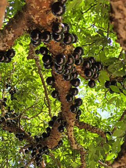 Jaboticaba is a round, edible fruit produced by a jaboticaba tree, also known as Brazilian grape tree. The purplish-black, white-pulped fruit grows directly on the trunk of the tree, making it an example of ‘cauliflory’. It is eaten raw or used to make jellies, jams, juice or wine.
