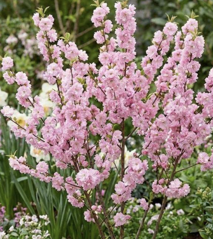 Flowering almond, also referred to as dwarf flowering almond, is a multi-stemmed deciduous shrub or small tree with a rounded crown that bears light pink (or occasionally white) double flowers in early spring. This tree is perennial in mild climates, thrives in full sunlight, and tolerates most soils, as long as the soil drains properly.